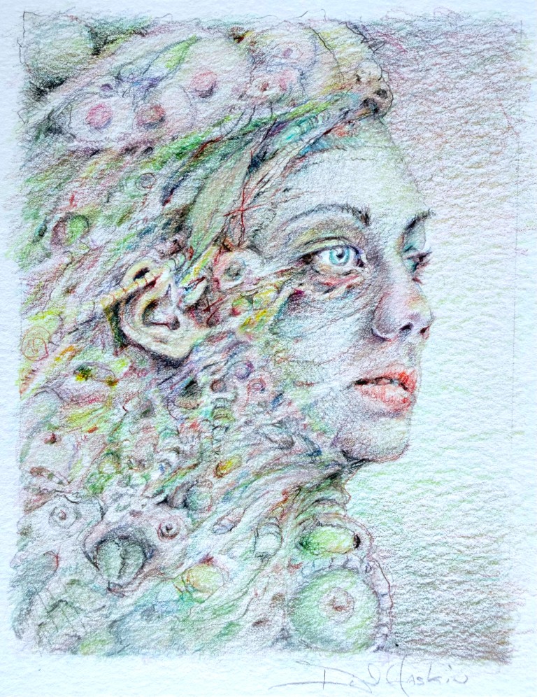 Haskin’s drawings are known for their intricate detail and evocative themes. He often explores abstract and surreal elements, at times blending them with a touch of pop surrealism. His work frequently features a mix of organic and geometric shapes, creating a dynamic and thought-provoking visual experience that can range from monochromatic studies to vibrant, colorful compositions, each telling a unique story.